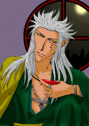 AKIRA姉さんのヴラドその2 後ろに薄っすらとある山のようなもの。 本当は杉の木か何かをイメージしてたんですけど・・・ グリグリ描いてたら山水画の山っぽく(笑) 姉に山に見えるよ!って言われたので結果オーライ。